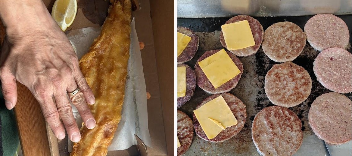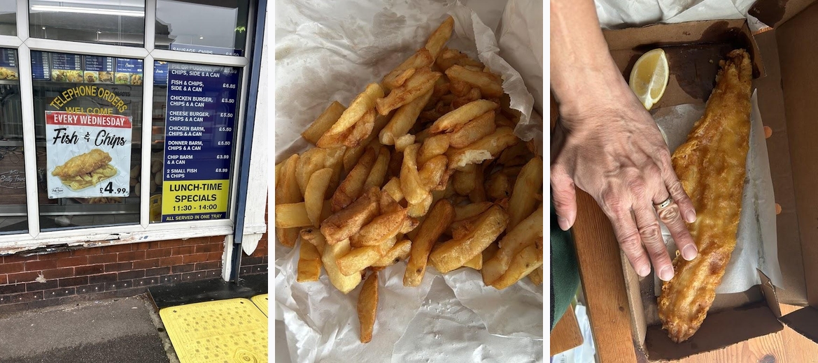 Must-try dishes include the traditional fish and chips, the large fish dinner, and various lunchtime specials like the chicken burger with chips.